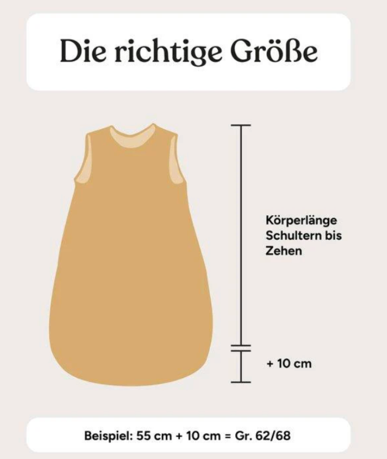 Beim Babyschlafsack Rund kannst du die Körperlänge von Schultern bis Zehen ausmessen und anschließend 10cm hinzu addieren. Das Ergebnis entspricht dann der passenden Größe.