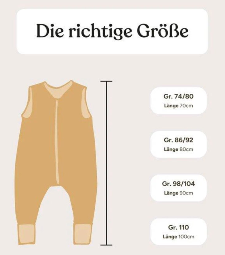 Für den Ehrenkind Babyschlafsack mit Beinen kannst du dich an der folgenden Tabelle orientieren, um die passende Größe zu finden.