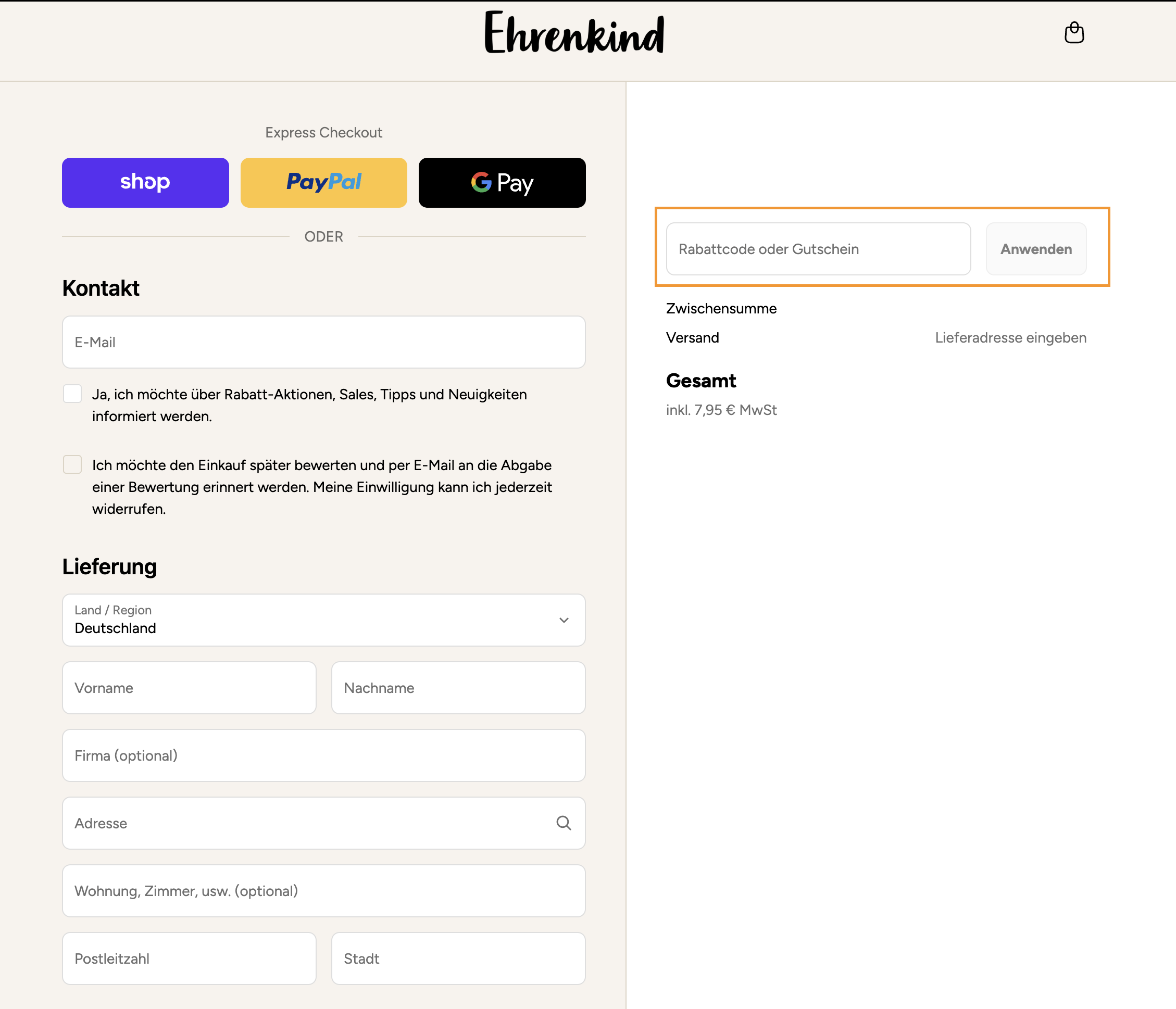 Wenn du einen Rabattcode hast, kannst du diesen auf der Kassenseite einlösen. Lege einfach deine gewünschten Artikel in den Warenkorb und begib dich zur Kasse.